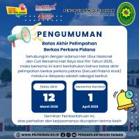 - Pengumuman Batas Akhir Pelimpahan Berkas Perkara Pidana dalam rangka Hari Libur Nasional dan Cuti Bersama Hari Raya Idul Fitri Tahun 2026