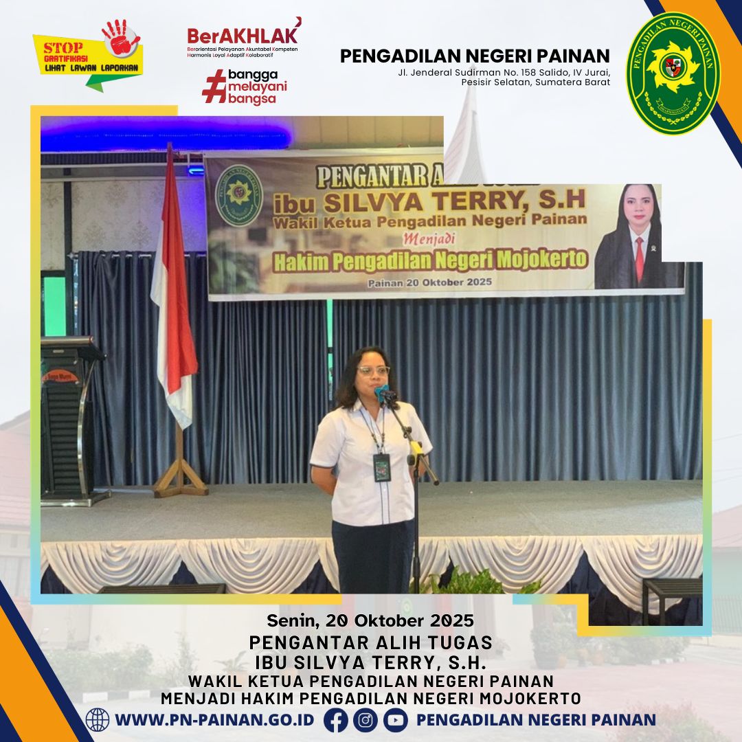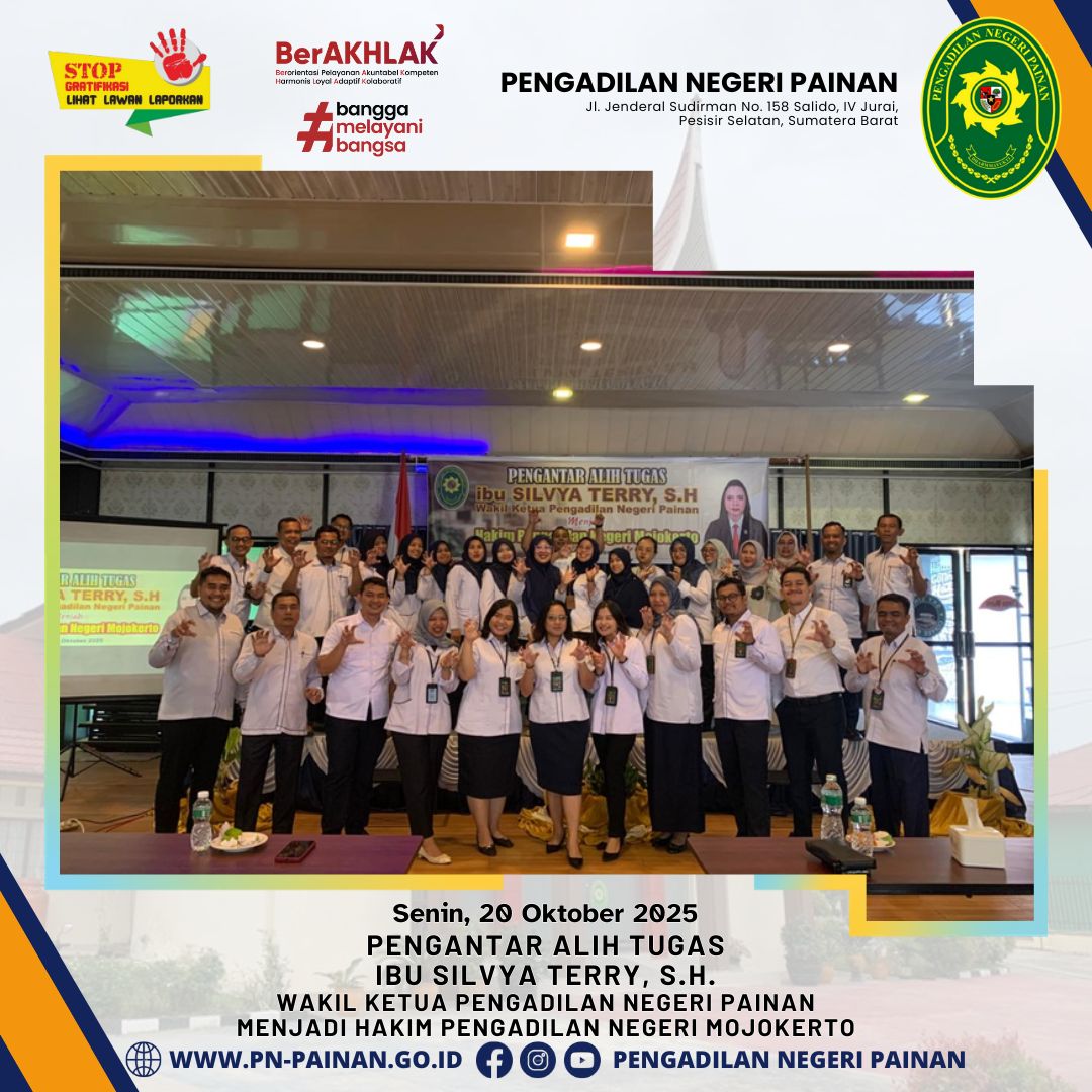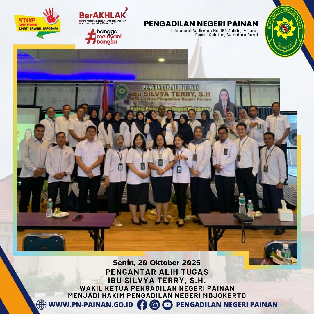 Pengadilan Negeri Painan telah melaksanakan kegiatan Pengantar Alih Tugas Ibu Silvya Terry, S.H. Wakil Ketua Pengadilan Negeri Painan menjadi Hakim Pengadilan Negeri Mojokerto