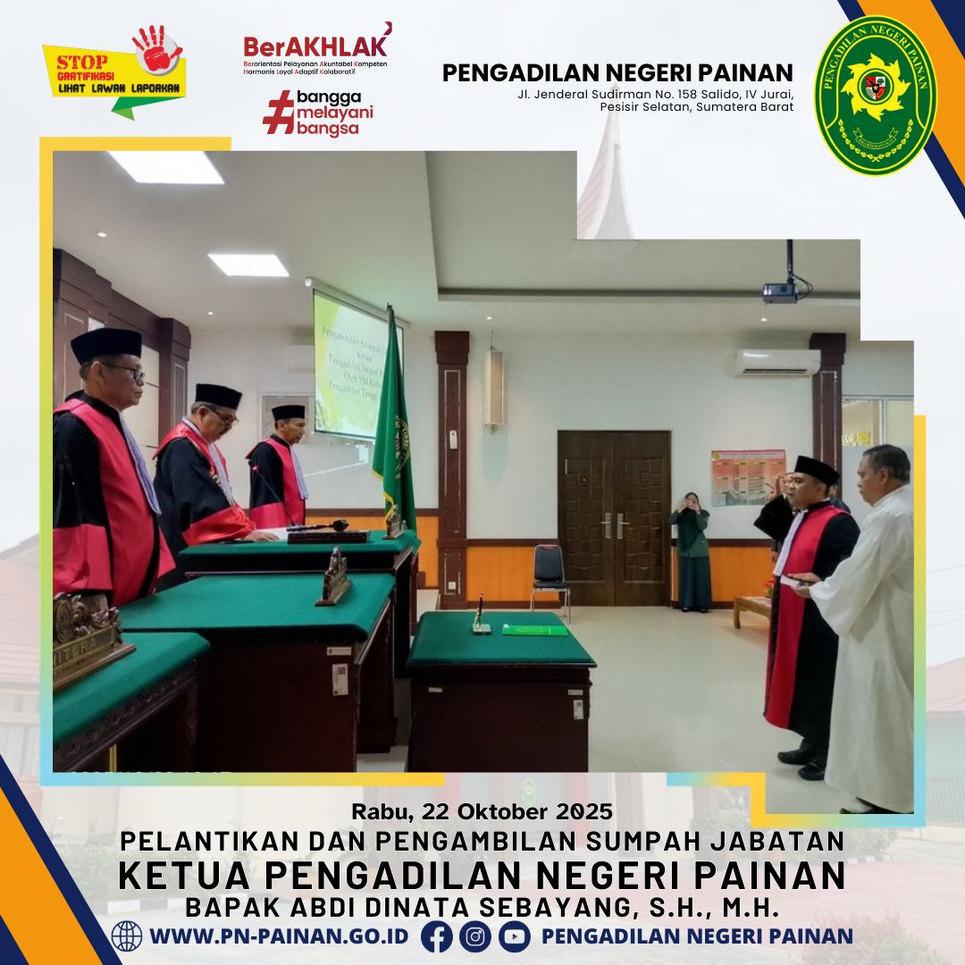Bertempat di Ruang Sidang Utama Pengadilan Tinggi Padang, telah dilaksanakan Pelantikan dan Pengambilan Sumpah Jabatan Ketua Pengadilan Negeri Painan atas nama :