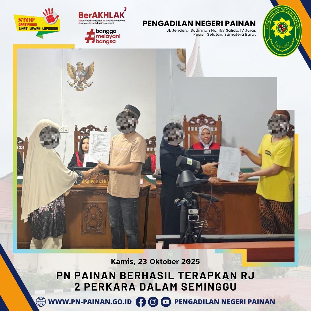Dalam seminggu Pengadilan Negeri Painan berhasil memutus 2 perkara dengan pendekatan keadilan restoratif sebagai implementasi dari Perma Nomor 1 Tahun 2024 tentang Pedoman Mengadili Perkara Pidana Berdasarkan Keadilan Restoratif