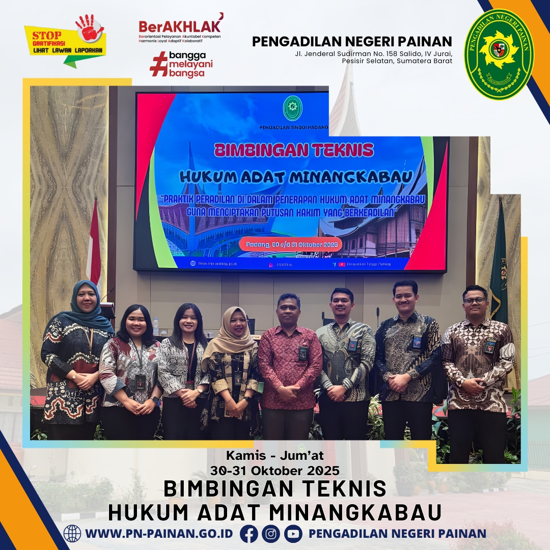 Ketua Pengadilan Negeri Painan Bapak Abdi Dinata Sebayang, S.H.,M.H. beserta Para Hakim Pengadilan Negeri Painan mengikuti Bimbingan Teknis Hukum Adat Minangkabau pada Pengadilan Negeri Se-Wilayah Hukum Pengadilan Tinggi Padang bertempat di The ZHM Premiere Padang.