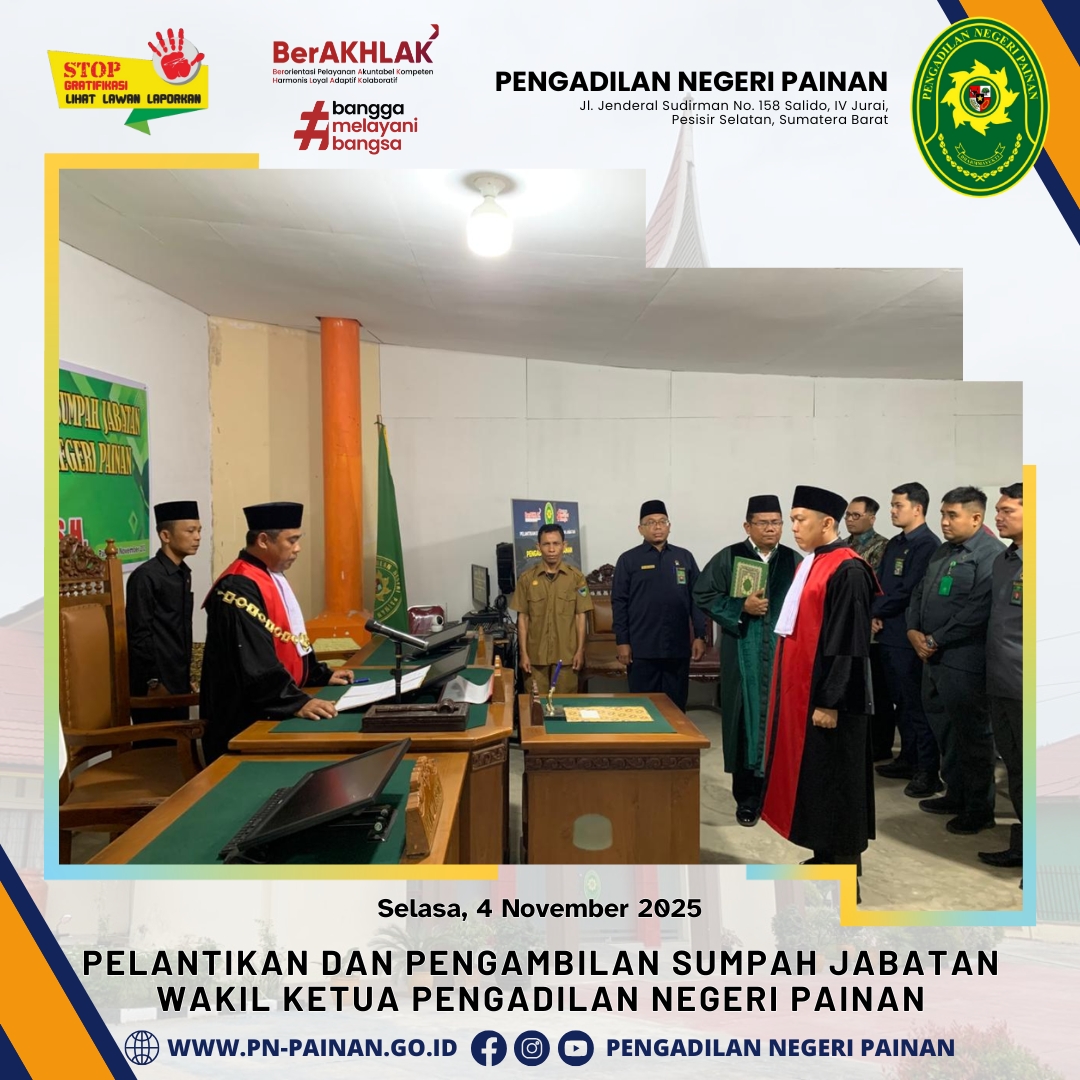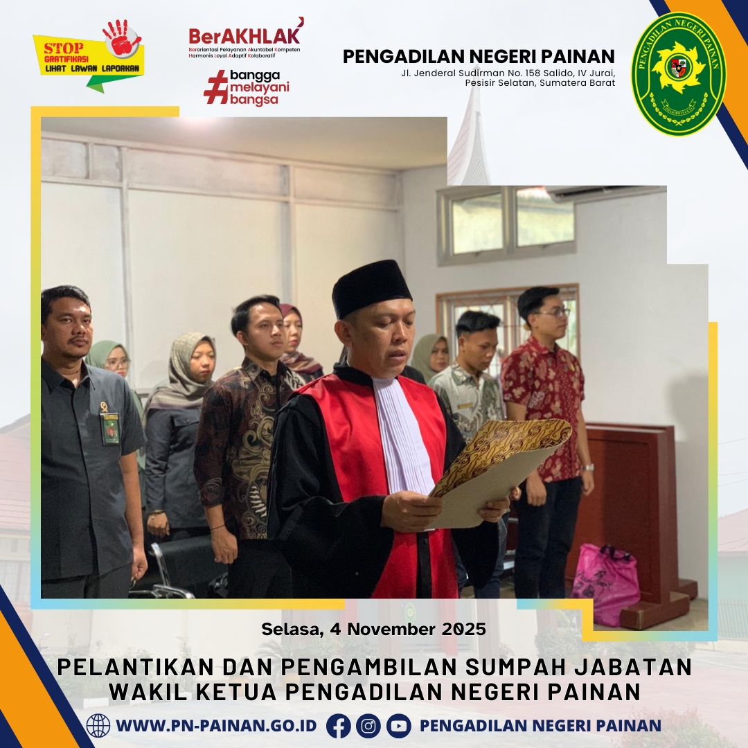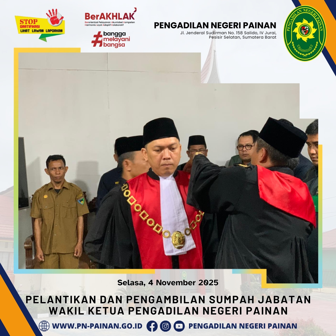 Bertempat di Ruang Sidang Utama Pengadilan Negeri Painan, telah dilaksanakan Pelantikan dan Pengambilan Sumpah Jabatan Wakil Ketua Pengadilan Negeri Painan atas nama :