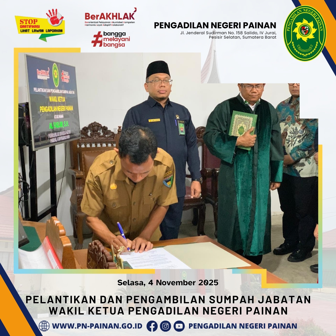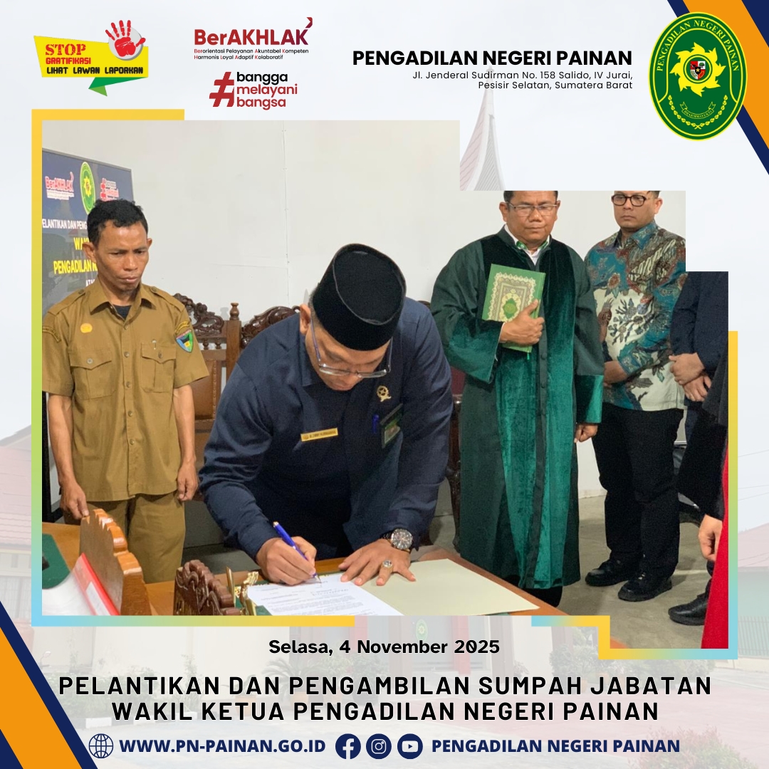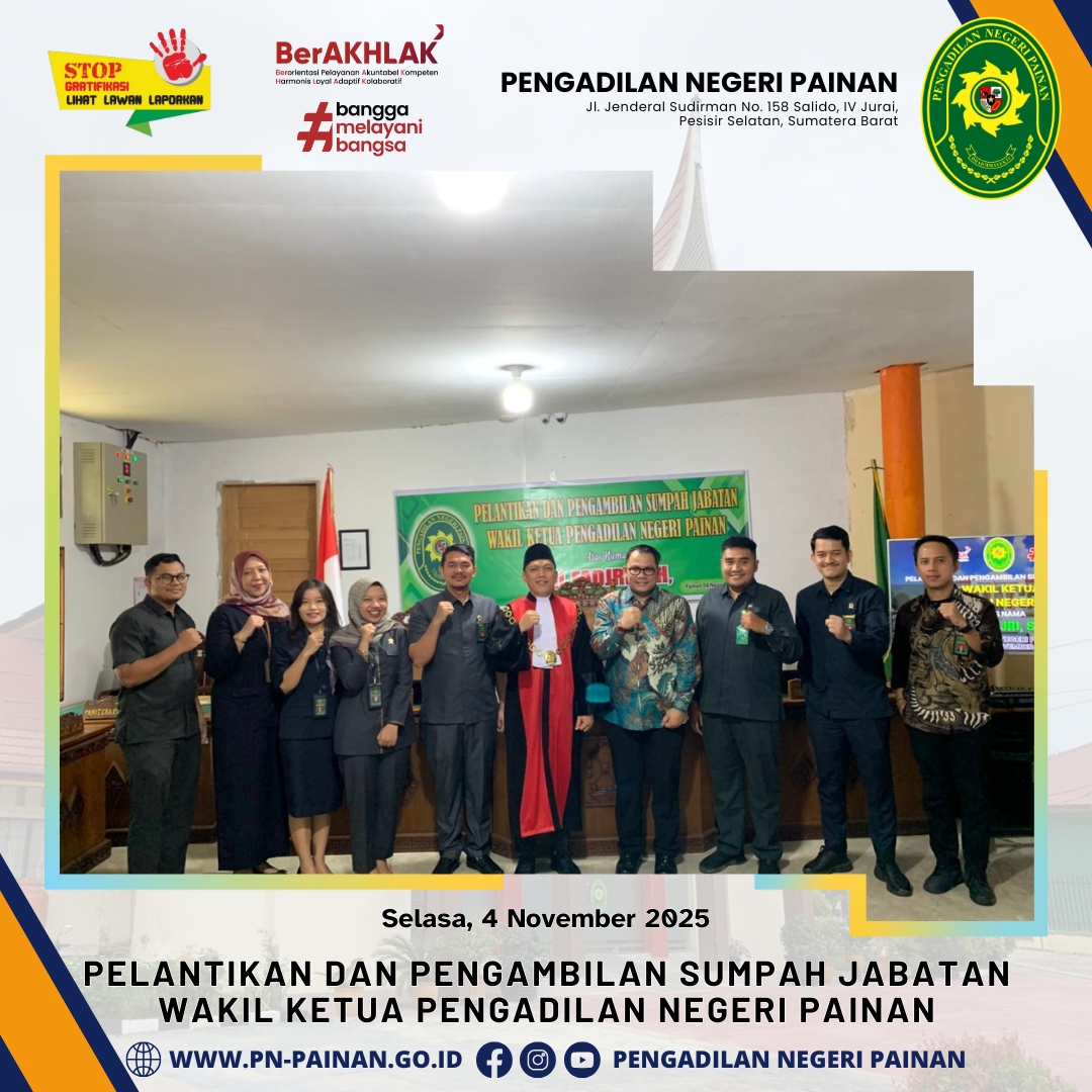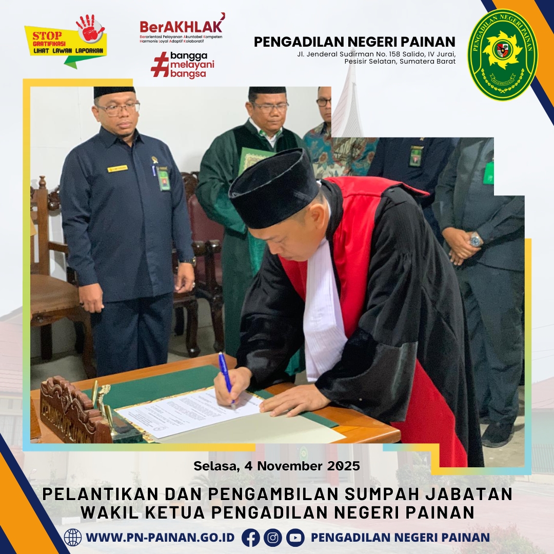 Bertempat di Ruang Sidang Utama Pengadilan Negeri Painan, telah dilaksanakan Pelantikan dan Pengambilan Sumpah Jabatan Wakil Ketua Pengadilan Negeri Painan atas nama :