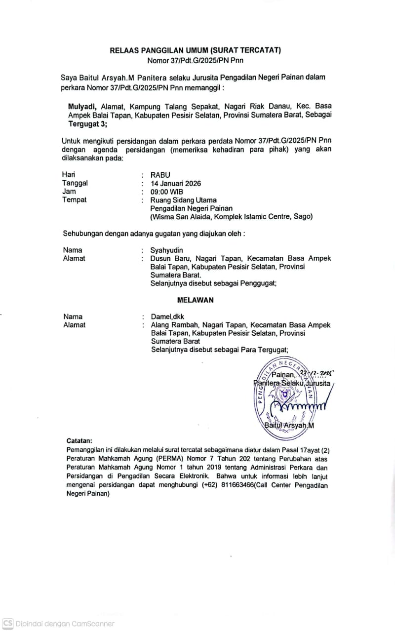 Relaas Panggilan Umum (Surat Tercatat) Nomor 37/Pdt.G/2025/PN Pnn An. MULYADI