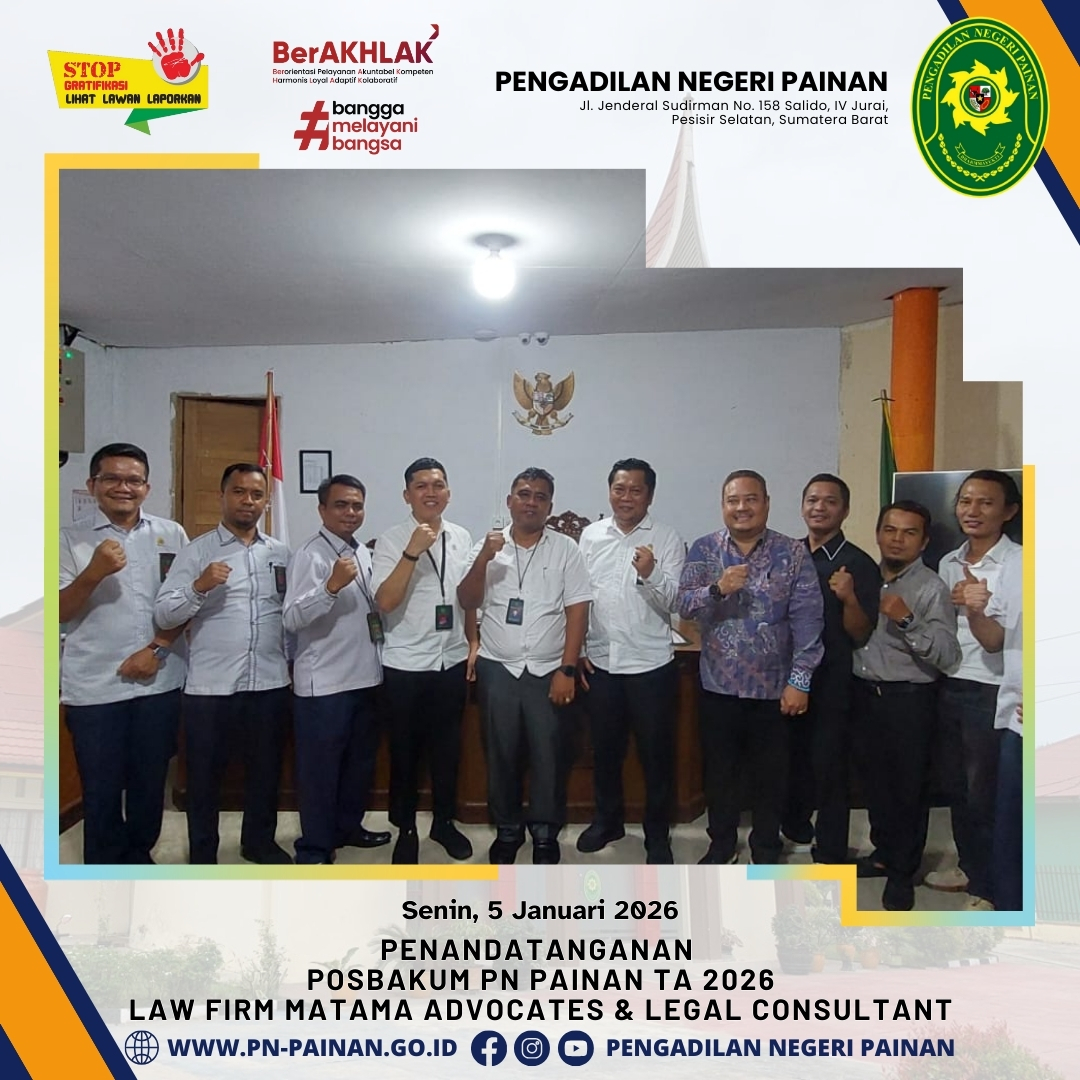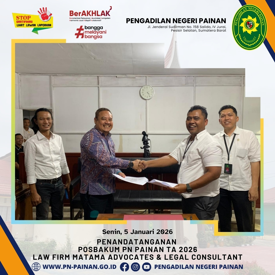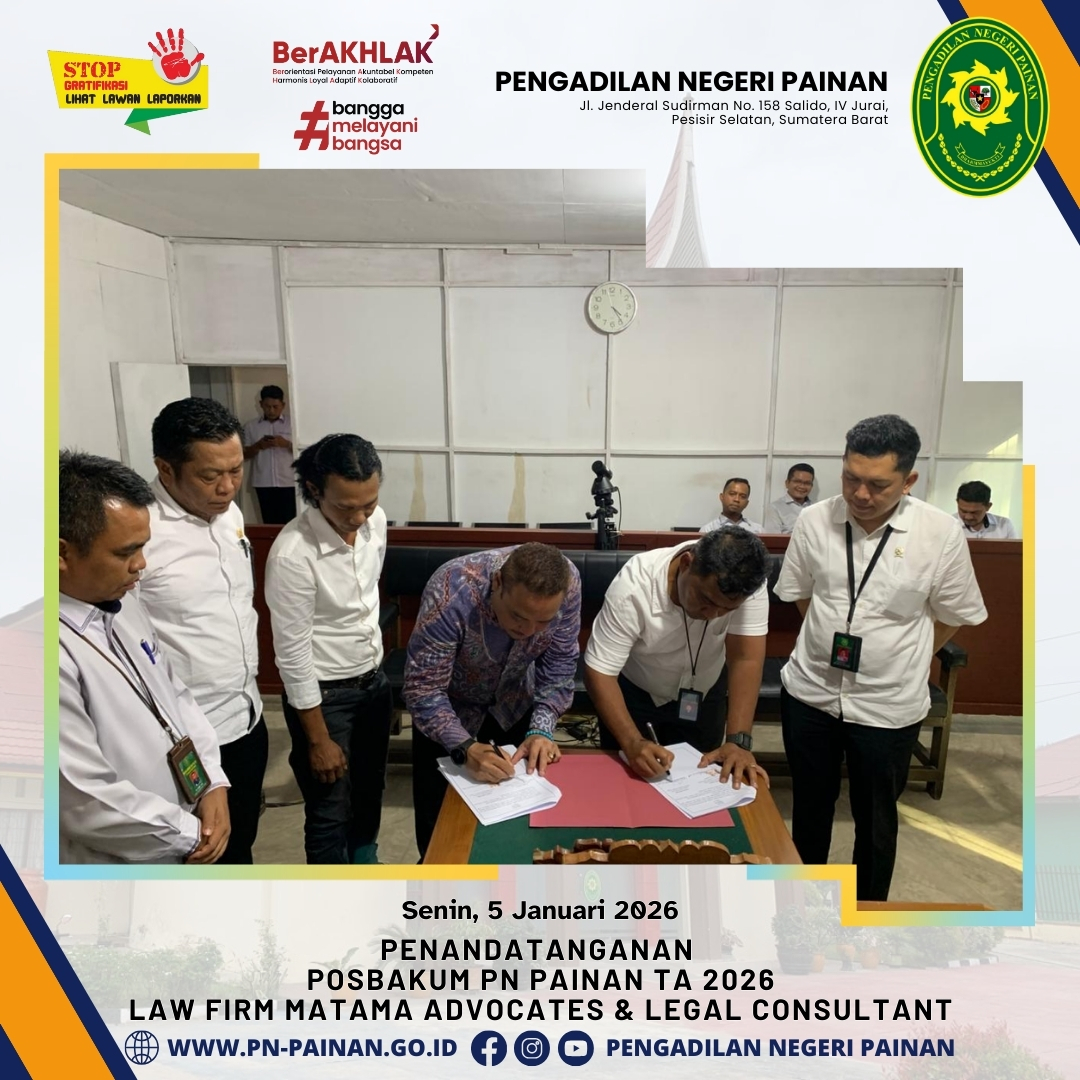Pengadilan Negeri Painan secara resmi telah melaksanakan Penandatanganan Perjanjian Kerjasama Pemberian Layanan Pos Bantuan Hukum (Posbakum) untuk Tahun Anggaran 2026. Sinergi ini dijalin bersama Law Firm Matama Advocates & Legal Consultant sebagai mitra penyedia layanan bantuan hukum.