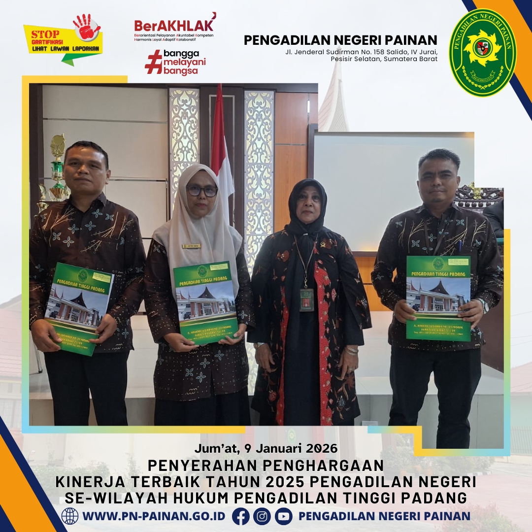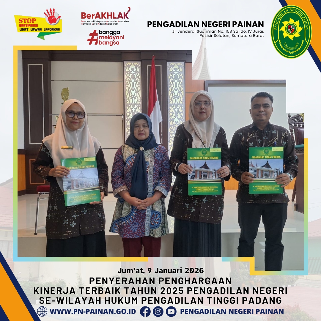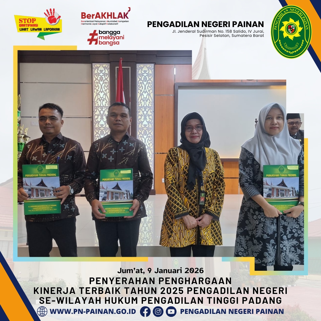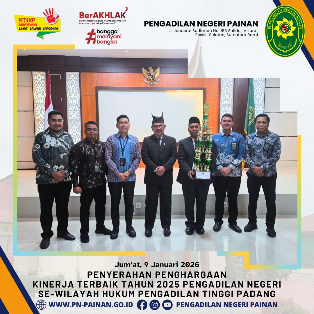 Pengadilan Negeri Painan menorehkan tinta emas dalam sejarah satuan kerja di lingkungan peradilan Sumatera Barat. Dalam acara yang digelar di Pengadilan Tinggi Padang, Pengadilan Negeri Painan dinobatkan sebagai Juara Umum Pengadilan Negeri dengan Kinerja Terbaik Tahun 2025 se-Wilayah Hukum Pengadilan Tinggi Padang.