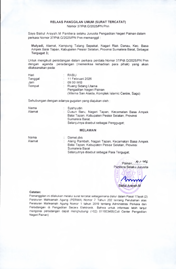 Berdasarkan Relass Panggilan Umum Nomor: 37/Pdt.G/2025/PN Pnn, diberitahukan kepada: