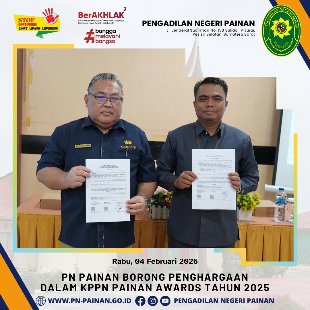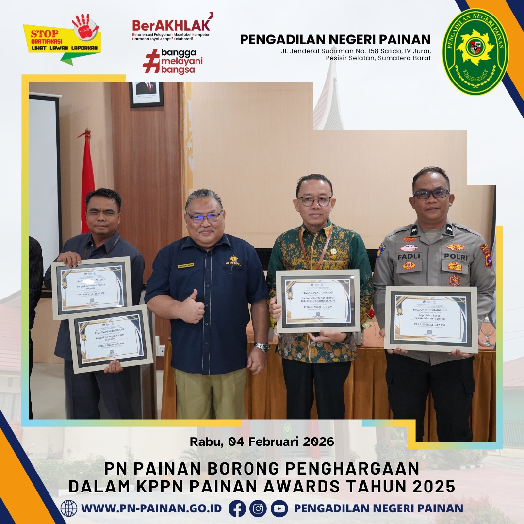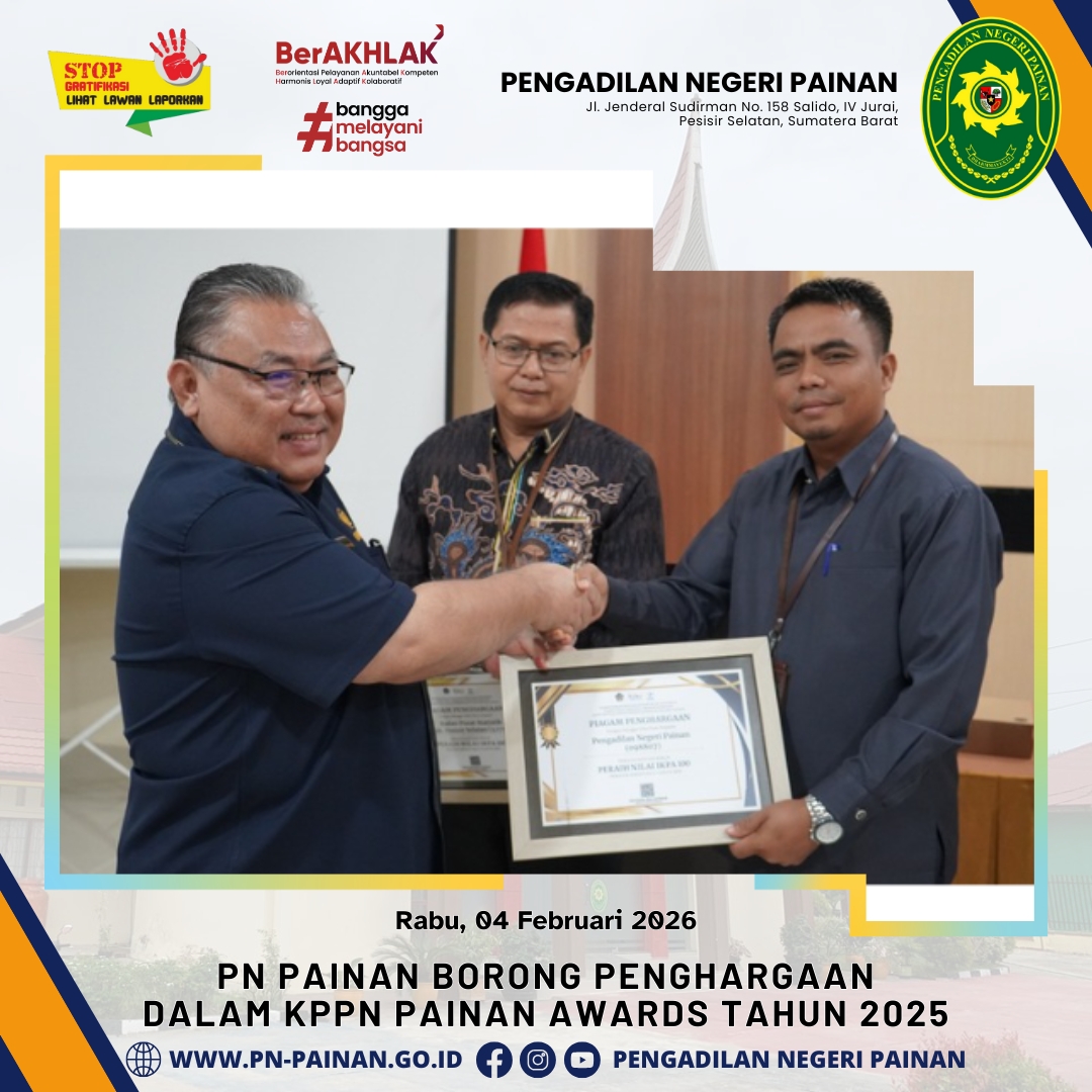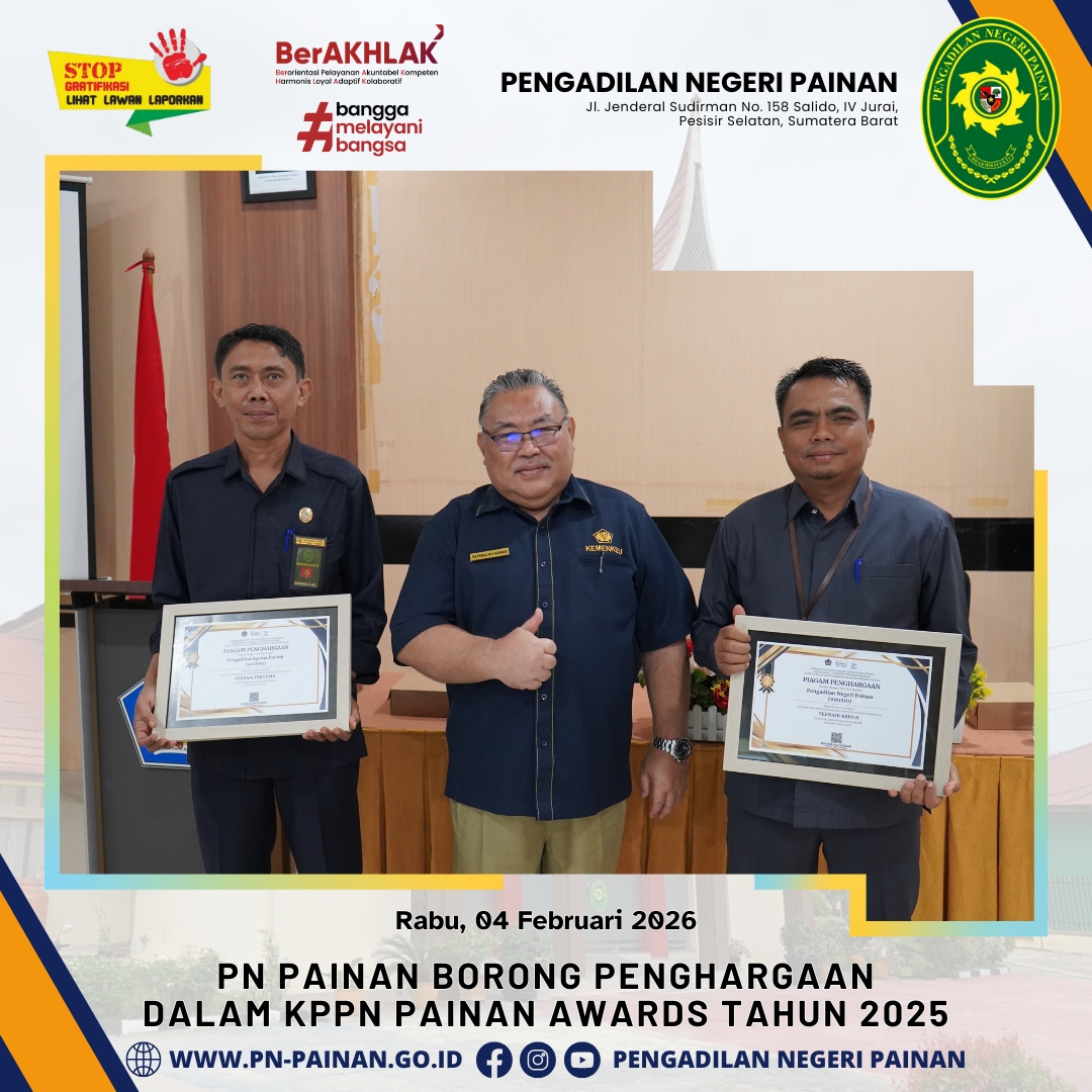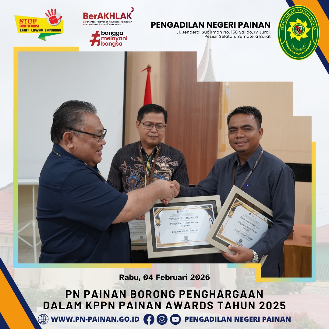 Dalam ajang penghargaan tersebut, Pengadilan Negeri Painan berhasil menorehkan prestasi gemilang dengan memboyong tiga penghargaan sekaligus atas capaian kinerja anggaran tahun 2025. Penghargaan tersebut diserahkan langsung oleh Kepala KPPN Painan, Bapak Refenalria Azwar, kepada Bapak Suyono, S.H.