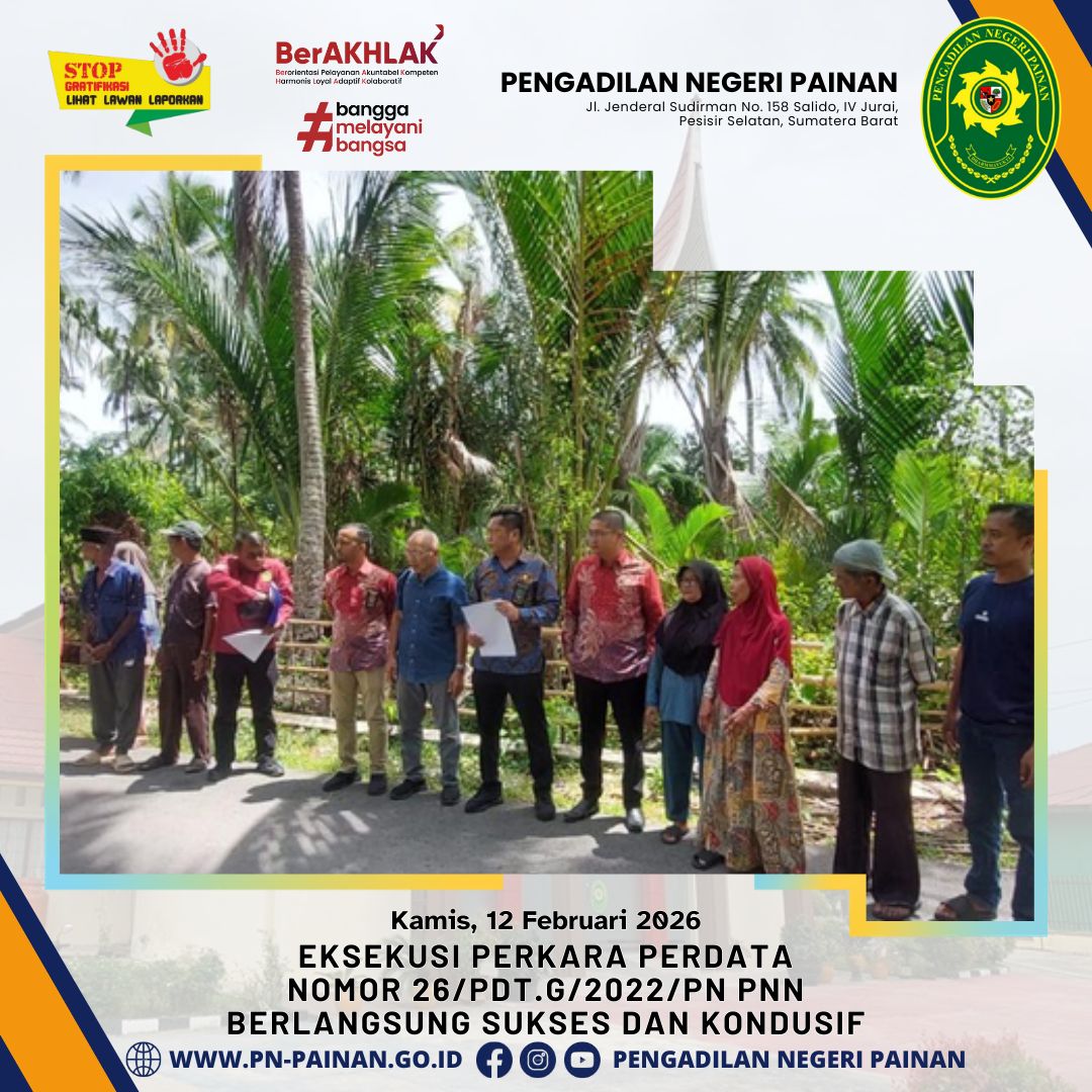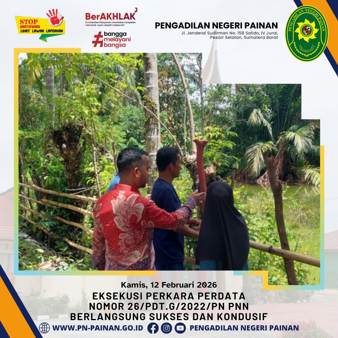 Pengadilan Negeri Painan telah melaksanakan eksekusi atas perkara perdata nomor 26/Pdt.G/2022/PN Pnn. Kegiatan ini merupakan tindak lanjut dari putusan pengadilan yang telah berkekuatan hukum tetap (inkracht van gewijsde).