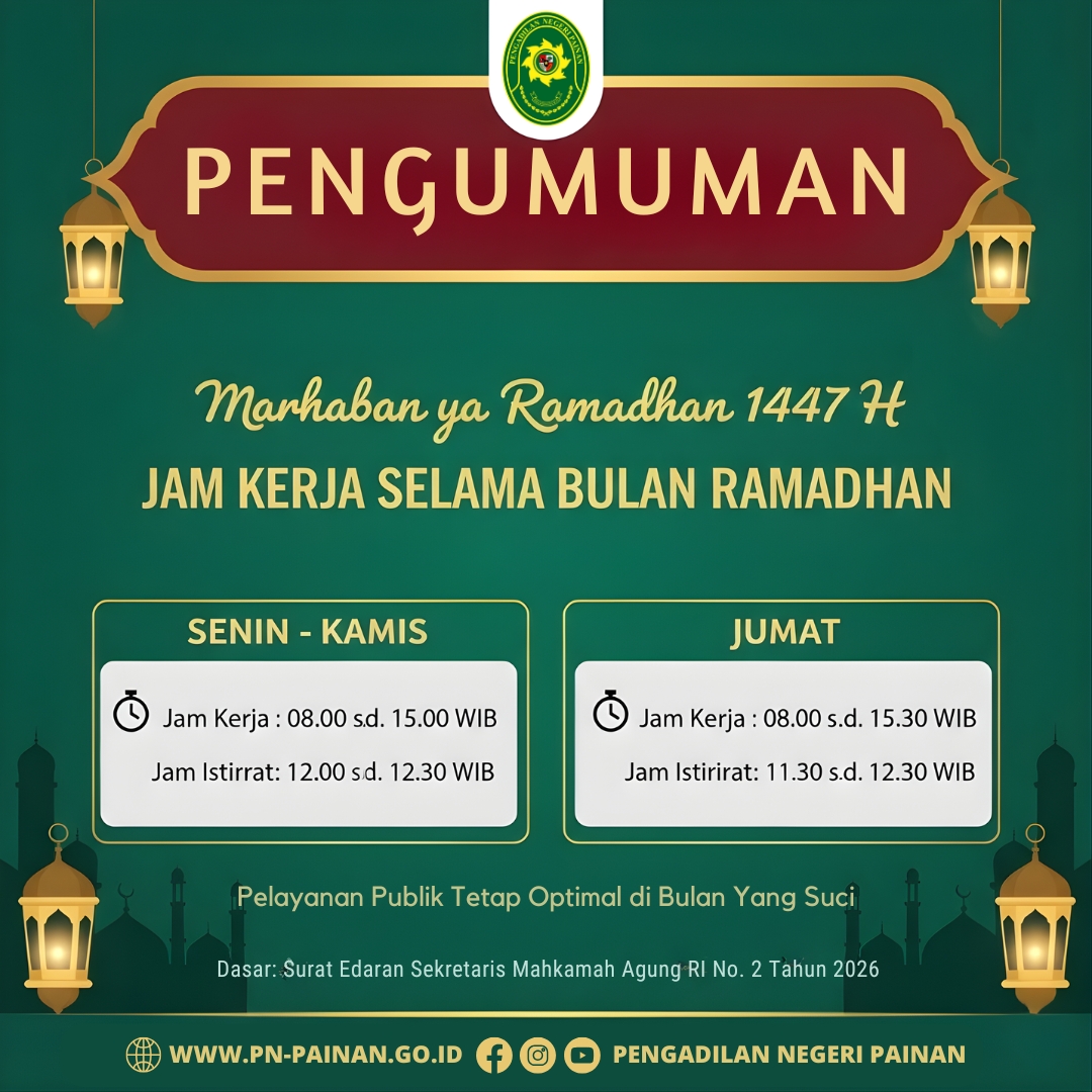 Berdasarkan Surat Edaran Sekretaris Mahkamah Agung RI No. 2 Tahun 2026, berikut adalah penyesuaian jam kerja dan pelayanan di Pengadilan Negeri Painan selama bulan suci Ramadhan 1447 H:
