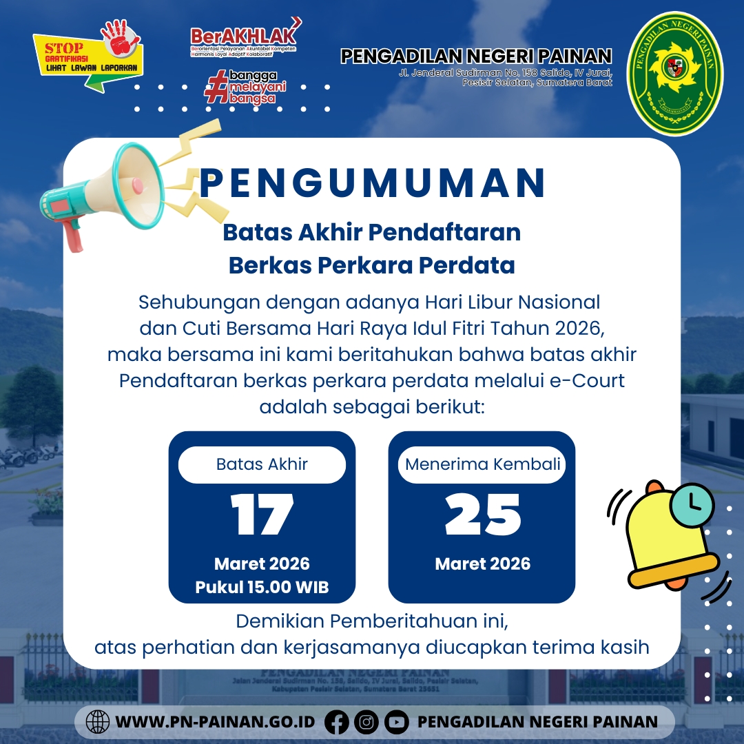 Sehubungan dengan Hari Libur Nasional dan Cuti Bersama Hari Raya Idul Fitri Tahun 2026, Pengadilan Negeri Painan menginformasikan batas waktu pendaftaran perkara perdata melalui e-Court sebagai berikut: