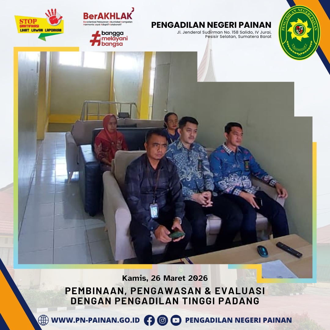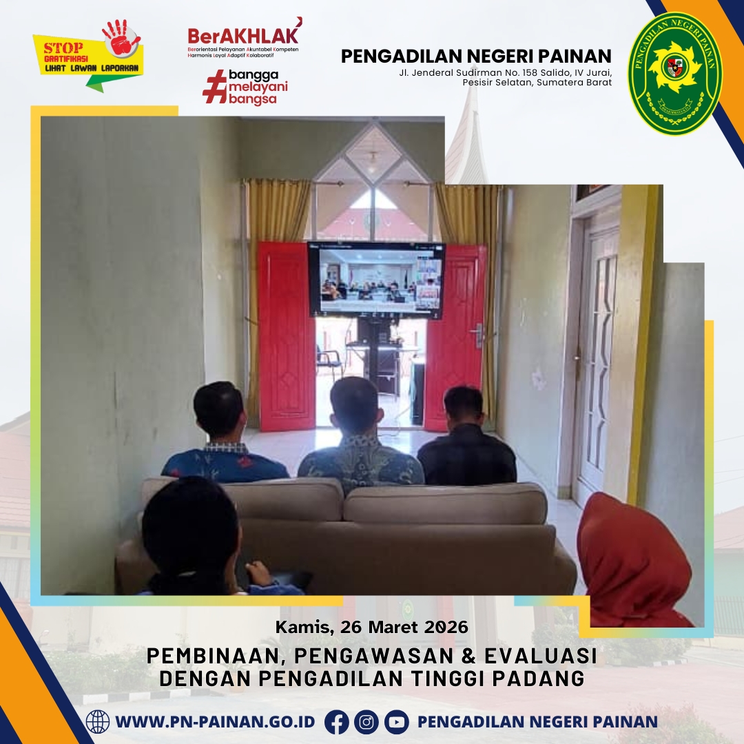 Pada hari Kamis, 26 Maret 2026, seluruh jajaran pegawai Pengadilan Negeri Painan turut hadir dalam kegiatan Pembinaan, Pengawasan, dan Evaluasi Kinerja yang diselenggarakan oleh Pengadilan Tinggi Padang. 🏢