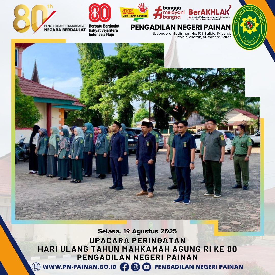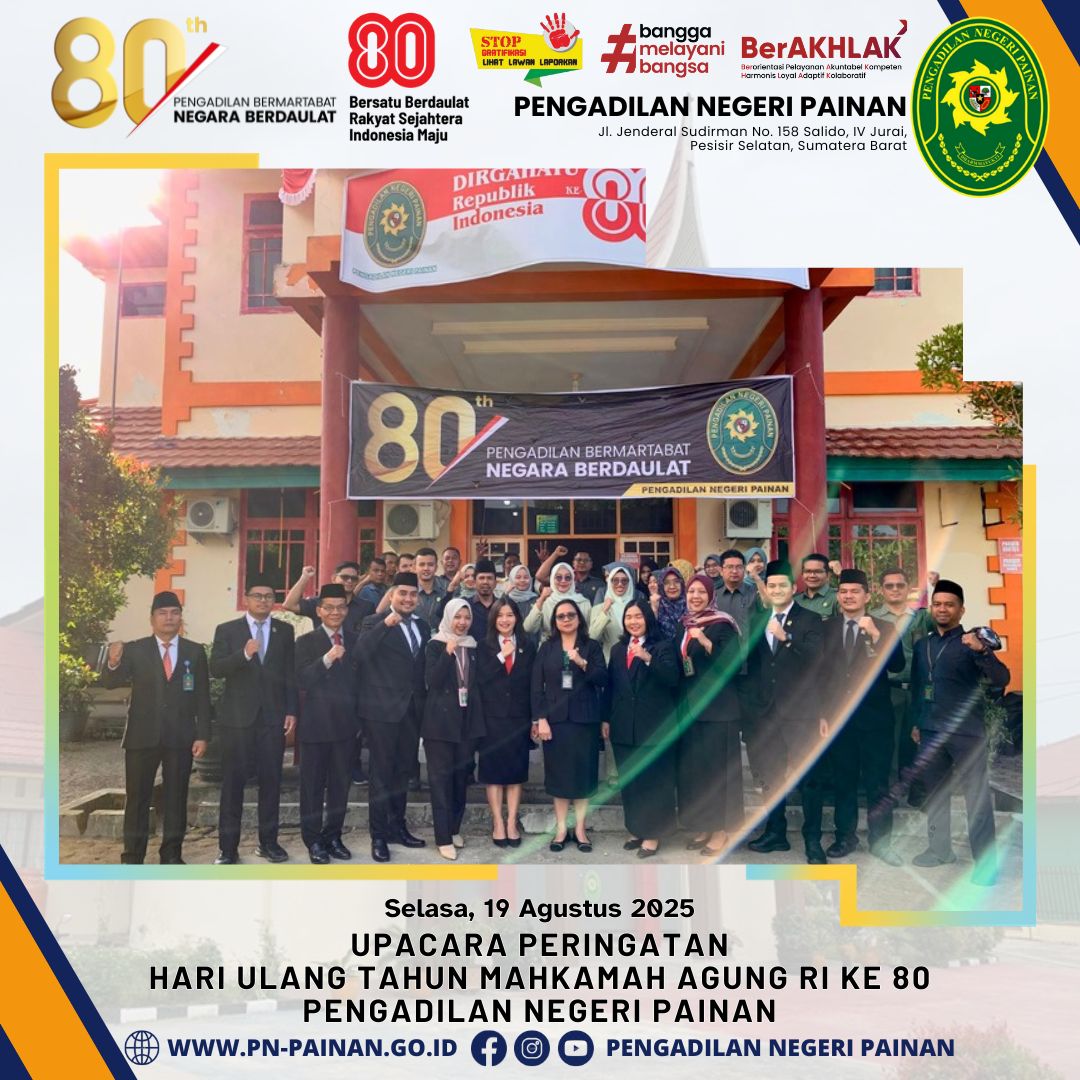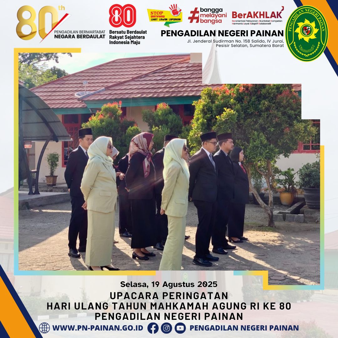 Pengadilan Negeri Painan melaksanakan Upacara Peringatan Hari Ulang Tahun Mahkamah Agung Republik Indonesia ke 80 yang berlangsung dengan khidmat di halaman kantor Pengadilan Negeri Painan.