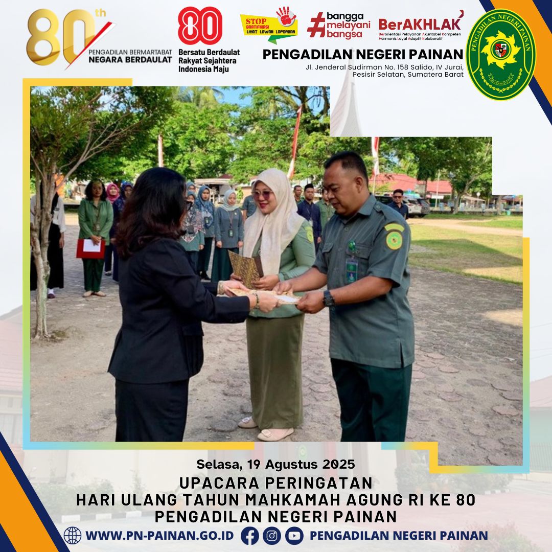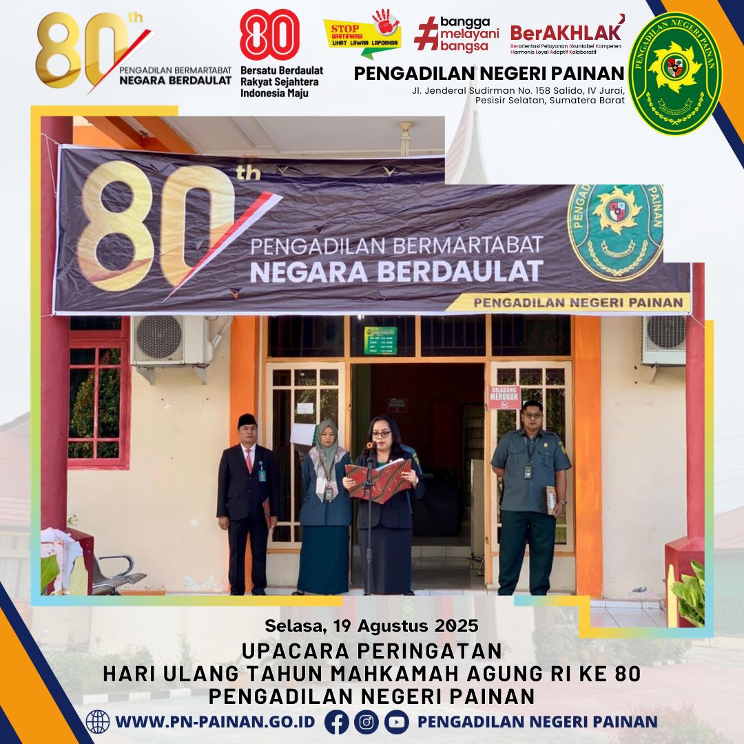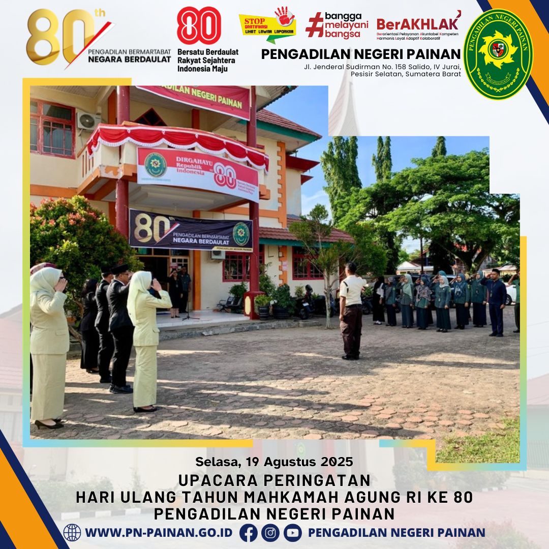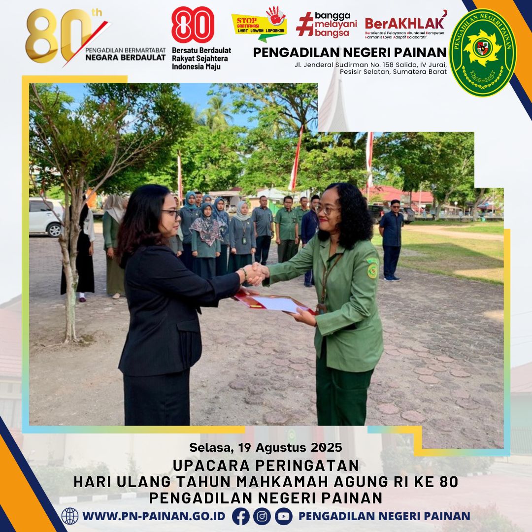 Pengadilan Negeri Painan melaksanakan Upacara Peringatan Hari Ulang Tahun Mahkamah Agung Republik Indonesia ke 80 yang berlangsung dengan khidmat di halaman kantor Pengadilan Negeri Painan.