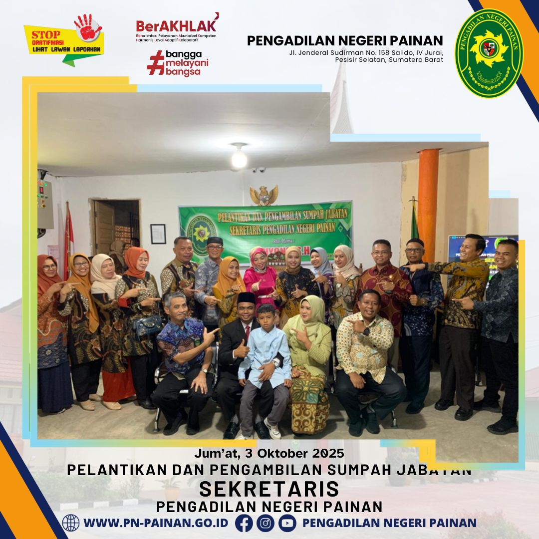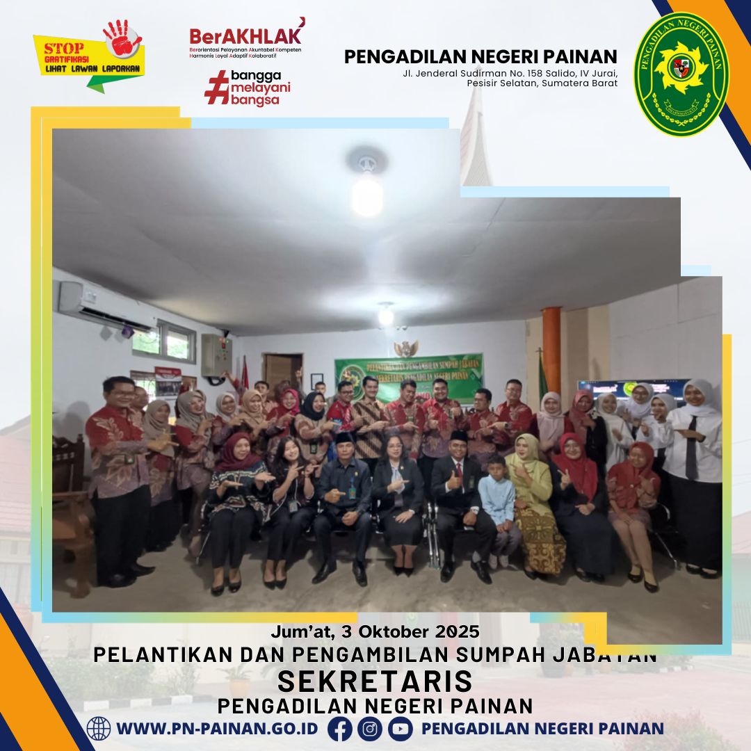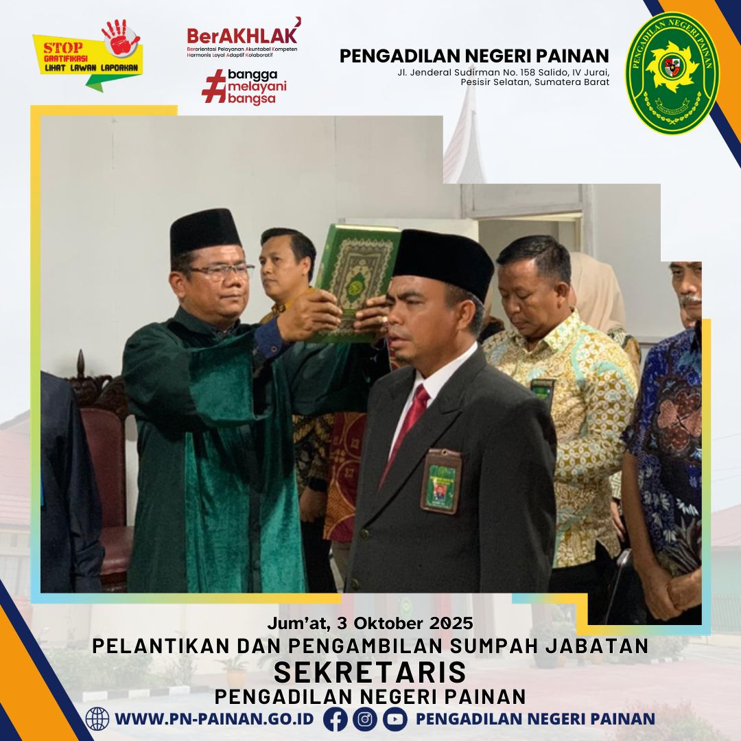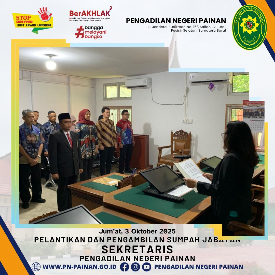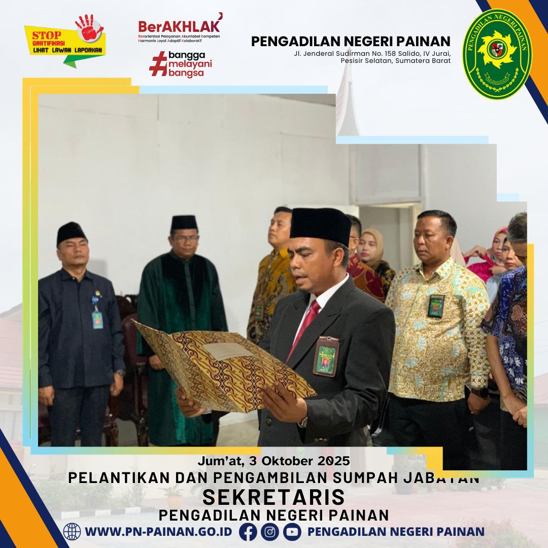 Bertempat di Ruang Sidang Utama Pengadilan Negeri Painan, telah dilaksanakan Pelantikan dan Pengambilan Sumpah Jabatan Sekretaris Pengadilan Negeri Painan atas nama :